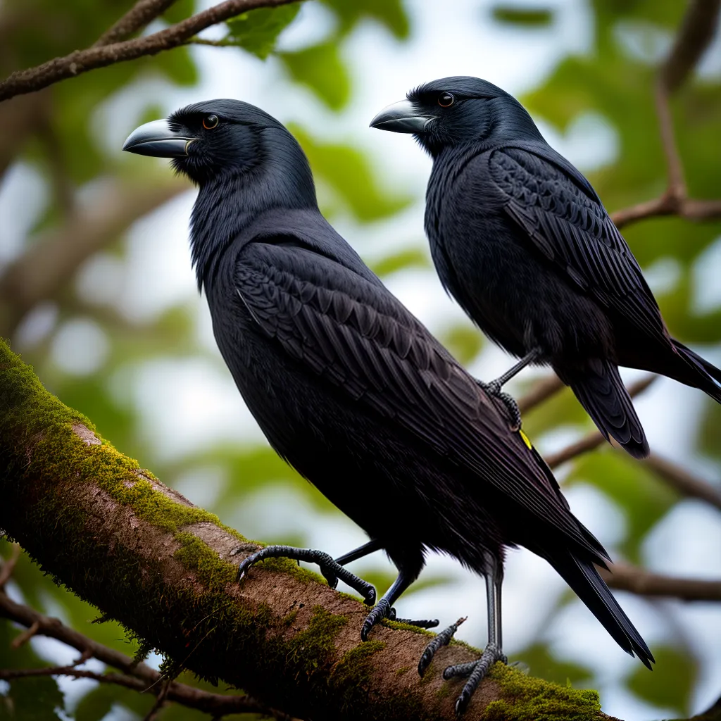 - Eles têm uma plumagem preta brilhante e um bico grande e forte.